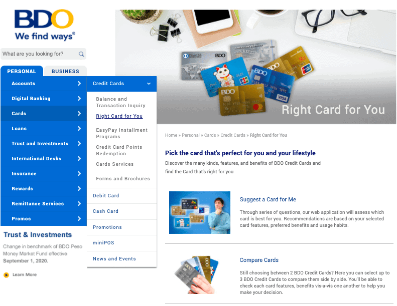 BDO has 24 credit cards with different kinds of use and interest rates. Choose the type of card you like from Basic, Premium, or Elite. The bank even lets you choose what brand you want from Visa, MasterCard, Diners Club, American Express, JCB, and UnionPay
