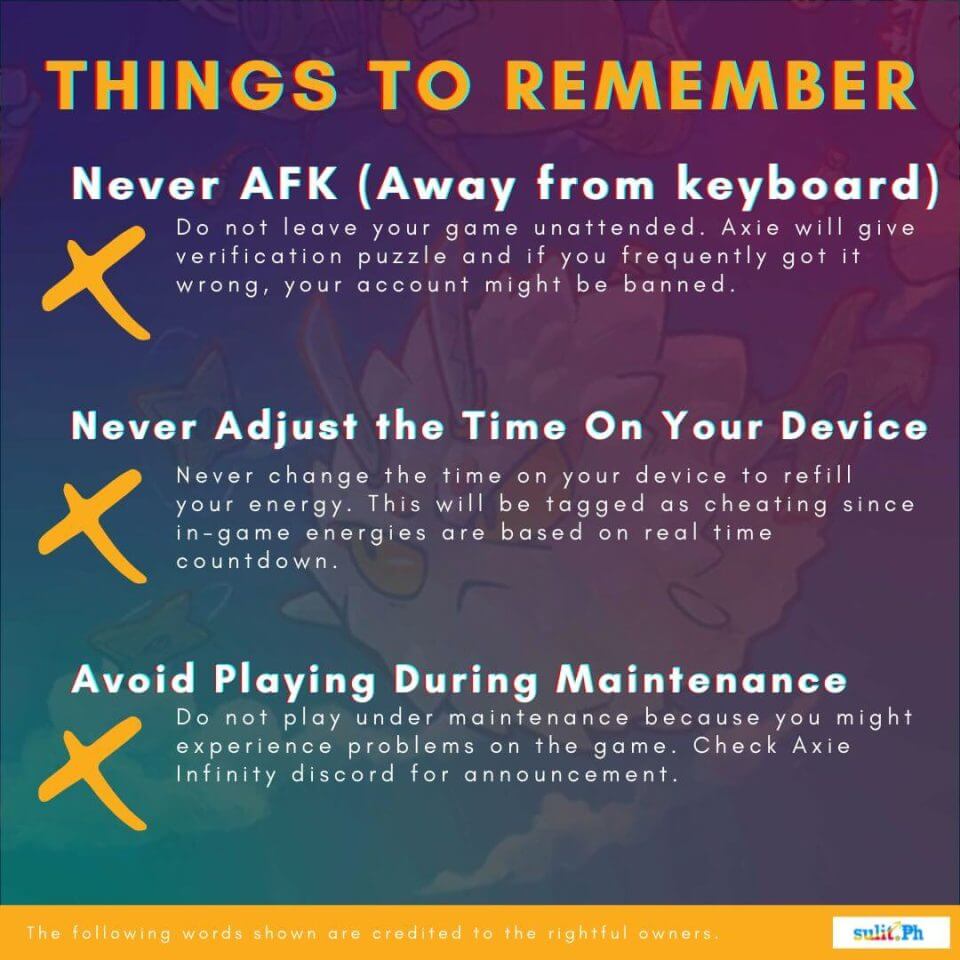 Here are the tips to avoid getting banned on Axie Infinity. You can download the images below or share them for your guide to not getting axed on axie infinity. Play fair, play by the rules and you will be able to play as long as you want.