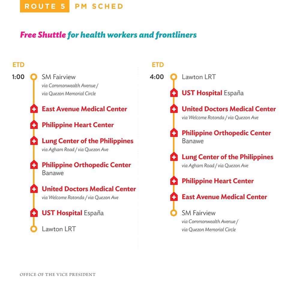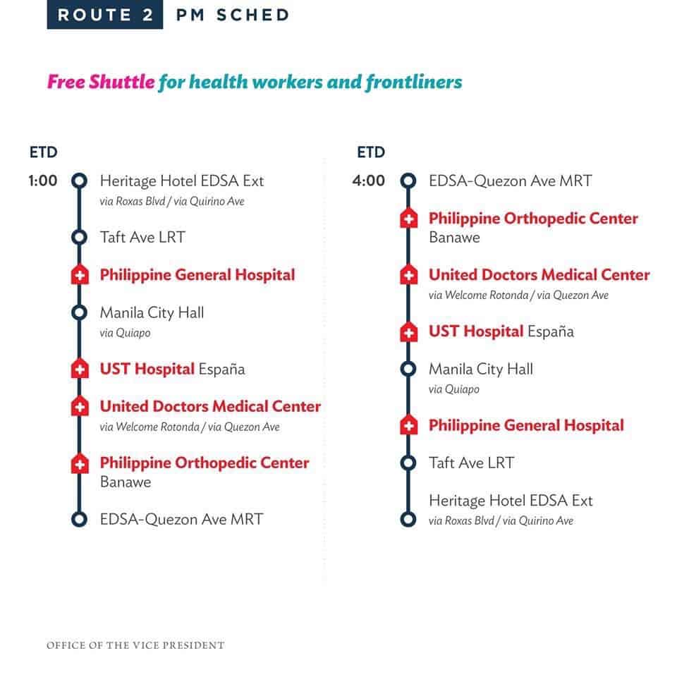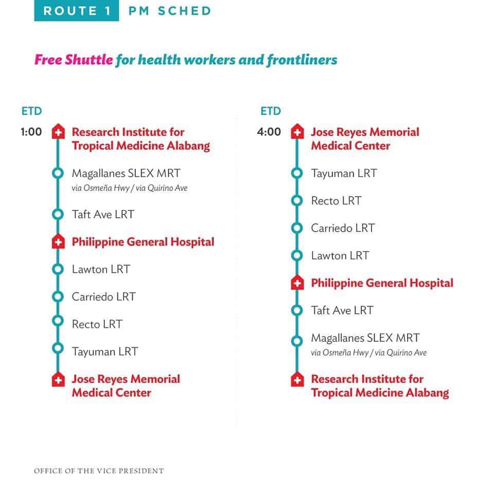 The Office of the Vice President announced on her official twitter account that they will provide a free shuttle service for our health workers and front liners who are putting themselves aside to care for everyone affected by this coronavirus disease (COVID-19) pandemic.