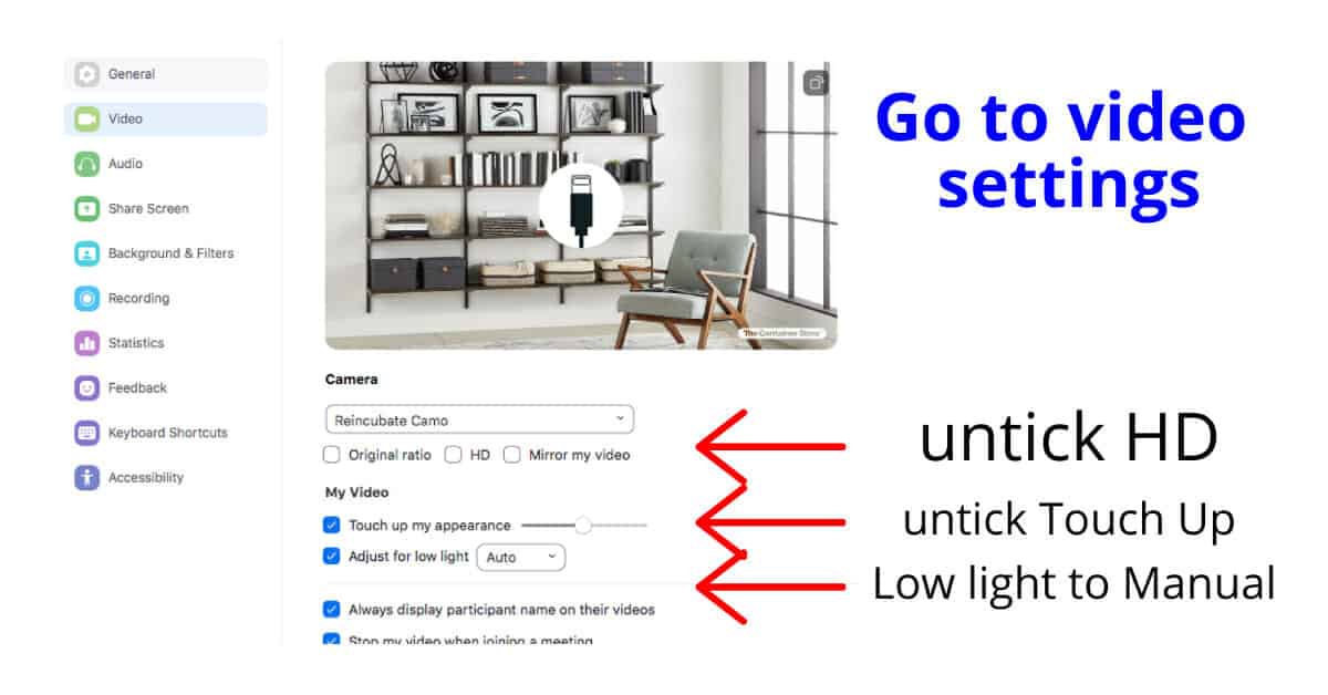 - Webcam required option – If you are required to leave your camera on, make sure HD Video is not on to save on bandwidth.
