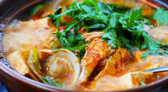 Sundubu jjigai is a hearty beef and barley stew flavored with doenjang (soybean paste), gochujang (spicy red pepper paste) and cheongyanggan (Chinese chili oil).