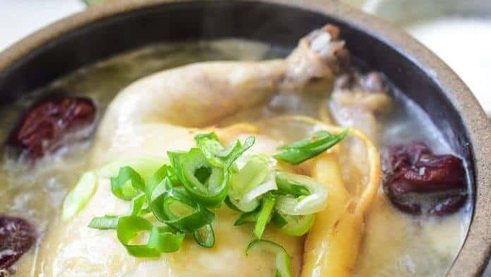 Samgyetang is chicken soup with ginseng and gomashio (crushed white rice). Ginseng helps improve energy levels while the crushed rice adds extra nutrients.