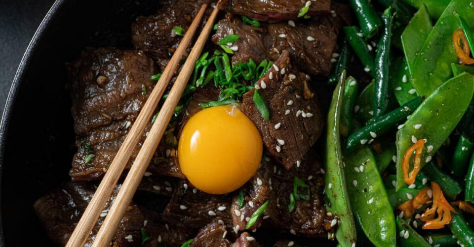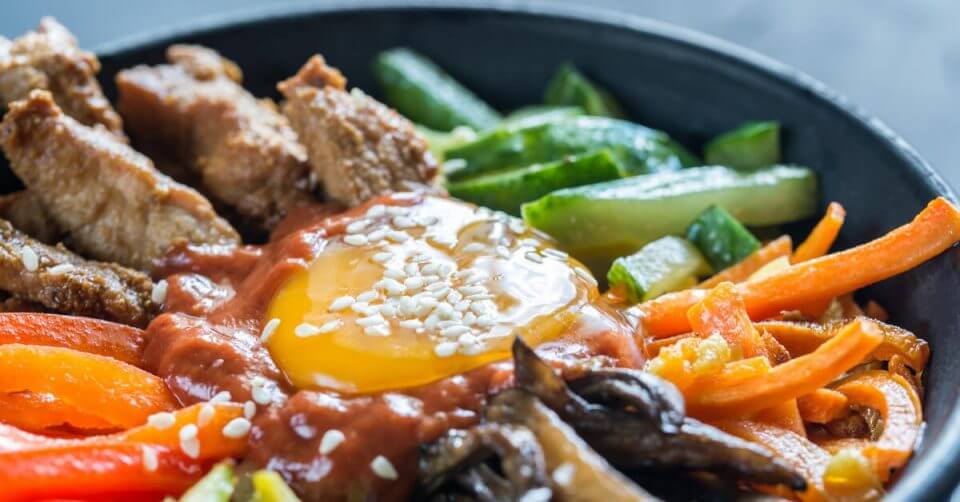 Bibimbap is a savory rice dish that includes vegetables and meat. The veggies are stir-fried in an iron skillet called a galbi. The meat serves as a great source of protein to help build muscles.