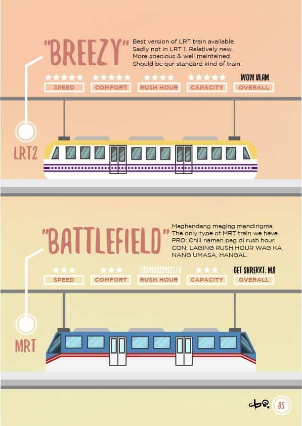 Battlefield (MRT) – “Maghandang maging mandirigma. The only type of MRT train we have. PRO: Chill naman pag hindi rush hour. CON: Laging rush hour, wag ka nang umasa, hangal.” This train gets an overall GET SHREkkt.M8 overall rating, with 3 stars each for Speed, Comfort, and Capacity, and a -7.8649… for Rush Hour. Clearly, no one should be riding this train.