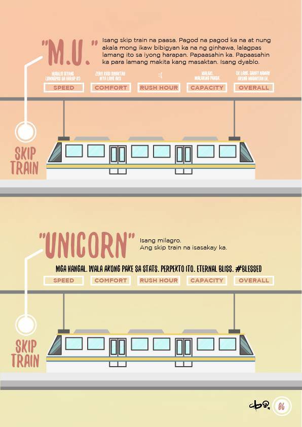 We’re no stranger to the hellish experience every Pinoy commuter goes through every day via the LRT and MRT. The long lines, the malfunctioning air conditioning units, the broken railways, the faulty breaks…the reasons for hating it are endless. Artist Ciara Baello took her Metro Manila train riding experience hugot to art. Using Adobe Illustrator CS5, Ciara created the manual in 4 parts: Prep, Paraan, Paghihirap, and Payo.