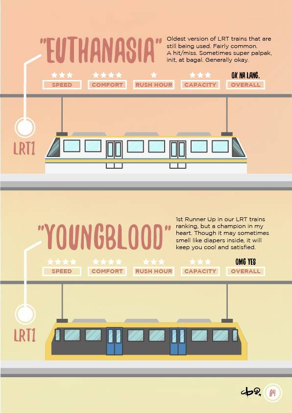 Euthanasia (LRT1) – “Oldest version of LRT trains that are still being used. Fairly common. A hit/miss. Sometimes super palpak, init, at bagal. Generally okay.” Ciara rates this train as OK NA LANG, giving it 3 stars for Speed and Capacity, 4 stars for Comfort, and 1 star for Rush Hour.