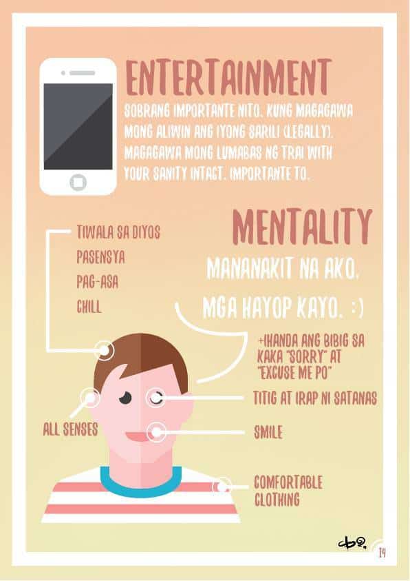 The LRT/MRT Manual also contains helpful (and pretty funny) illustrated tips on how to ride AKA survive the trip. She lists down the basic necessities (shown below), tips on keeping your place, and warnings on the types of people to look out for during the ride.