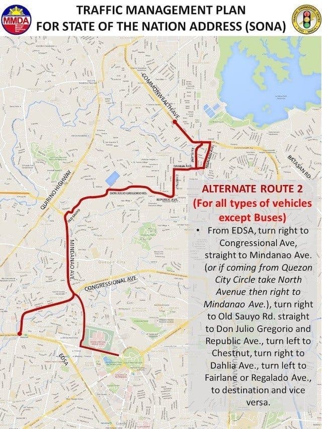 In a couple of hours, the 15th president of the Republic of the Philippines Benigno “Noynoy” Aquino III will be delivering his last State of the Nation Address (SONA). Roads have been re-blocked, with MMDA setting alternate roads for commuters along Commonwealth Avenue (see below).
