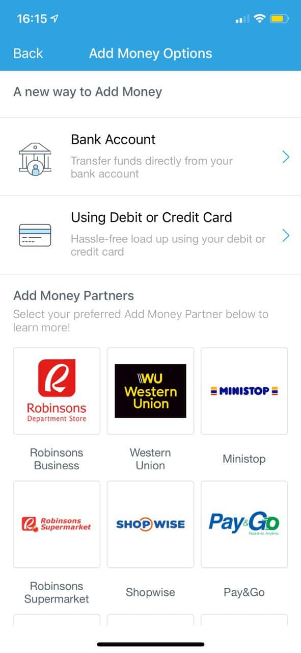 You can add money to your PayMaya with more than 40,000 partners such as 7-Eleven, Palawan Pawnshop, Smart Padala Centers, SM Stores Business Services and Robinsons Department Store Business Centers. You can also add through Bank and Debit/Credit card.