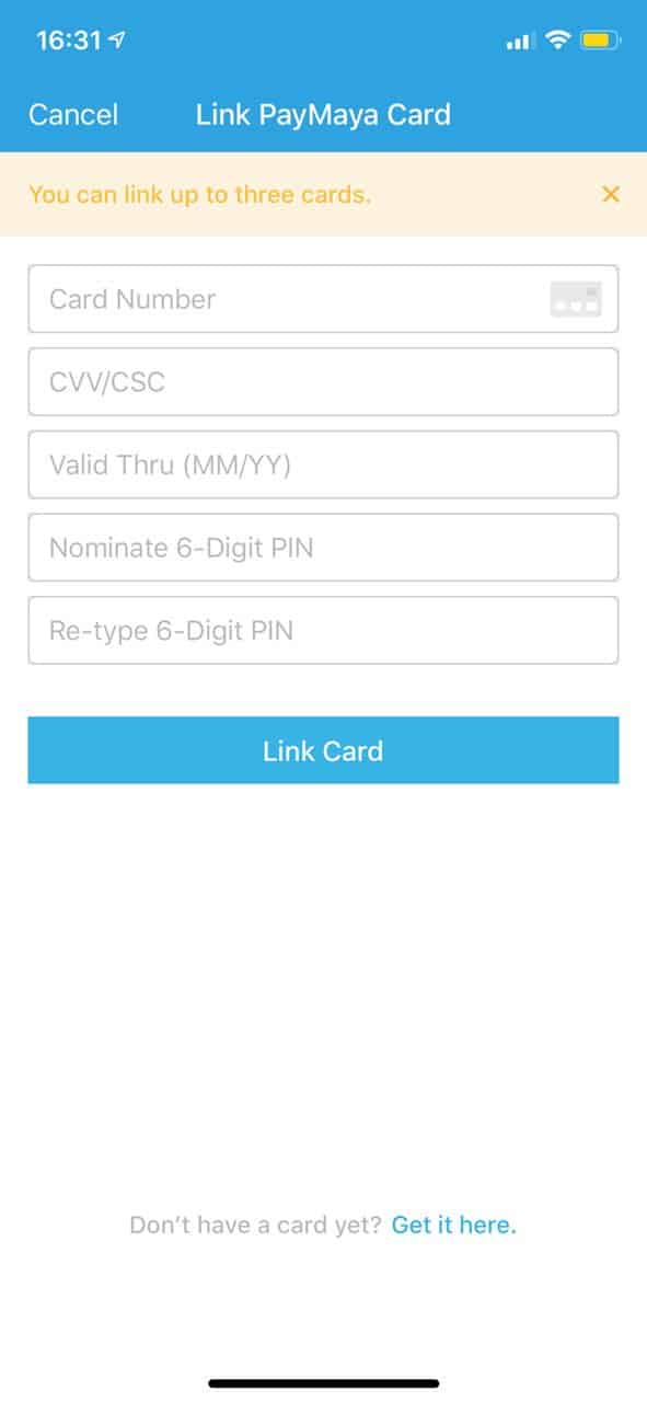 - If you have an existing PayMaya Card, you can link it to your mobile wallet. Enter teh card details and click Link Card. If you don’t have a card yet, get it here.