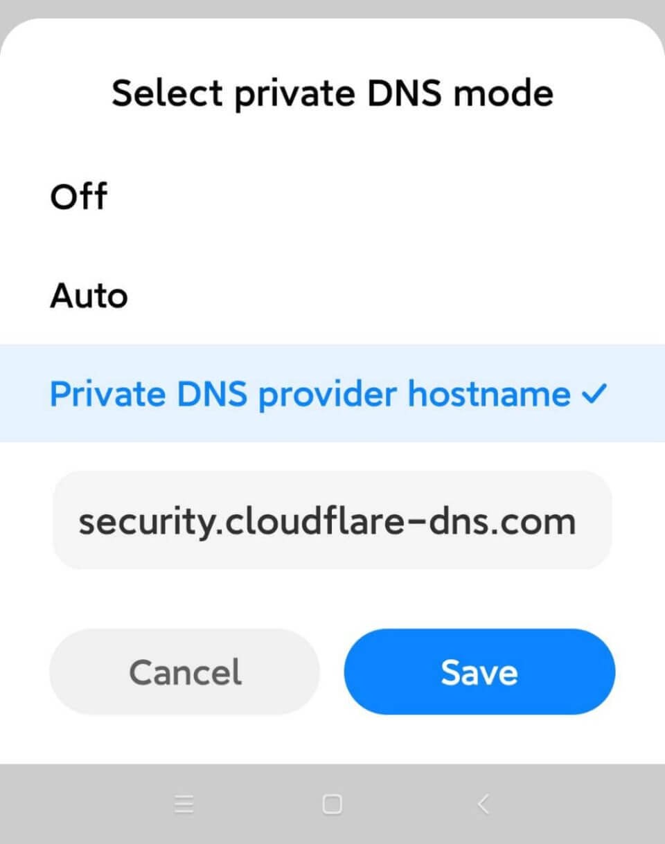 That’s the easiest and safest method to change your DNS permanently. You must be on the latest version of Android (9 or up) to do this. Then you’ll see an option for private dns, which should be off by default. Turn it on and then select private DNS provider hostname and enter the name of the DNS provider you want.